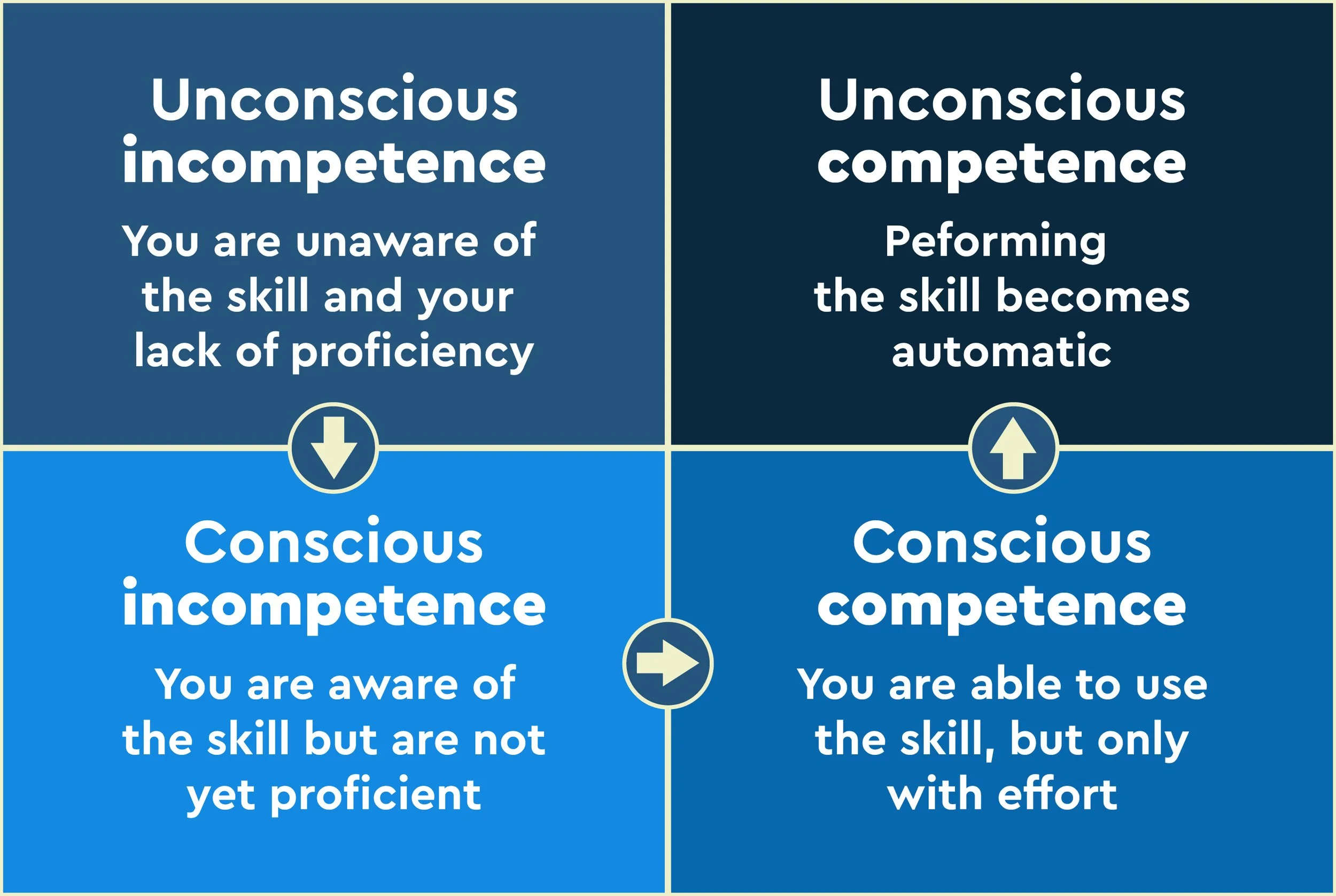 Helps you zoom in on awareness, capability, confidence and focus. Imagine a small child, 3 or 4 years of age, they just wouldn't know what they don't know yet about how to drive a car well - they have no awareness whatsoever. Fast forward to teenage years, and a 16/ 17 year old begins to be aware of all the things you need to remember and think about when driving a car - MSM, hand position, clutch control/ bite-point, indicating, changing gears.... and then into new driver territory, when a recently passed driver concentrates hard on what they've recently learned (hopefully that's the case !) before becoming a long-established driver and perhaps some casual habits creep in. See how that could apply in the Conscious Competence cycle below. Then, consider your role and where you sit. And others in your business, what level of awareness, capability & confidence do they have. And what's your role as leader/ manager. Question for you - which of the four zones is often touted as the best for growth, and why?